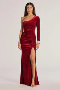 The Sonya long velvet mermaid dress features an off-the-shoulder neckline with long fitted sleeves, a ruched front seam leading to a bold high-cut slit, and a floor-sweeping mermaid silhouette. Complete the formal outfit with a rhinestone necklace set.