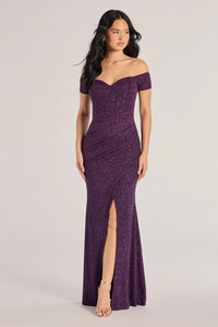 Radiate elegance in a long mermaid glitter dress that features an off-the-shoulder neckline with a sweetheart bust, short sleeves, a corset-like bodice with flexible boning for structure, a wrap silhouette, and a high side slit. Complete the wedding guest outfit with a rhinestone clutch.