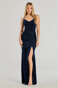 The velvet glitter dress features a sleeveless cowl neckline, adjustable spaghetti straps that cross at the back, an open back design, a high side slit, and a long hem length with a mermaid silhouette. Complete the formal outfit with a rhinestone clutch.
