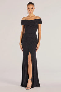 Have an iconic moment at your black-tie soiree in the gorgeously chic Verona velvet formal dress designed with a satin off-the-shoulder fold-over neckline and a large bow back accent with a cascading floor-length train. The dress features a high-cut side slit to showcase some leg on the long slim-fit silhouette.