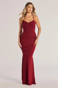 The long mermaid dress features a glitter knit fabrication, a sleeveless cowl neckline, spaghetti straps that lead to a cross-back design, and a lace-up back design. Complete the formal outfit with a satin clutch.