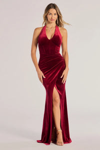 The velvet dress features a sleeveless halter neckline, a corset bodice accented with flexible boning, a high slit, and a wrap mermaid silhouette. Complete formal outfit with rhinestone earrings.