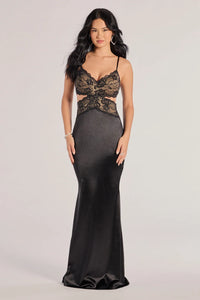 Create a gorgeously chic look for your formal affair in Aliana dress designed with a sheer lace bodice with a contrast nude-tone lining and a satin-knit floor-length mermaid silhouette. It features a sleeveless V-neckline, adjustable spaghetti straps for a customized fit, and dual waist cutouts for a sultry detail.