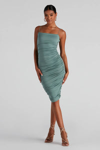 Make them stop and stare at this stunning dress that commands attention! The sleek midi dress features a trendy square neckline, sleek bungee straps, and a curve-hugging ruched midi silhouette. Complete your look with duster earrings for your night-out outfit.