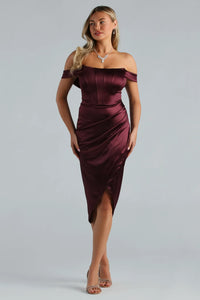 Leave the room breathless in the sweet Coraline formal dress at your next fancy affair! She stuns in an off-the-shoulder neckline with pleated sleeve cuffs and a sultry corset bodice with flexible boning. Her empire waist effortlessly shapes the wrap midi skirt designed to give you a curvy look. The dress is composed of silky smooth satin fabric with minimal stretch. Complete your look in a glam necklace set and heels.
