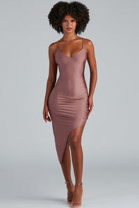 Showcase a sleek sheen in this gorgeous satin midi dress! The knee-length dress features a sleeveless cowl square neckline with pleating, adjustable spaghetti straps for a customized fit, and ruched detailing. A sparkly rhinestone trim cascades from the side to the front leading to a midi-length, asymmetrical hem creating a chic side slit to show off your legs. Style this curve-hugging dress with metallic heels for your next fancy date night.