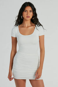 Everyday Style Short Sleeve Ruched Mini Dress Everyday Style Short Sleeve Ruched Mini DressLevel up your everyday style with this simple yet chic mini dress! The lightweight smooth nylon fabric includes a knit lining and offers plenty of stretch for ultra-comfortable wear. Shaped with a classic scoop neckline and short sleeves, the mini-length dress features ruching down the side seams to flaunt your figure on the bodycon silhouette. Pair with a denim jacket and sneakers. Fit & Features - Smooth nylon fabric with knit lining, plenty of stretch