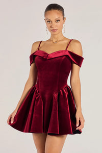 Elevate your formal outfit in a luxe velvet short dress featuring an off-the-shoulder collared sweetheart neckline, adjustable spaghetti straps, a drop-waist design, and a pleated skater silhouette. Complete the outfit with glitter mesh heels.