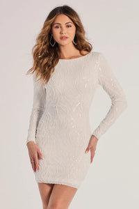 Exude chic elegance and glamour in the Brea formal mini dress crafted with lined mesh fabric with intricate sequin and beaded embroidery in an abstract swirl pattern. It features a crew neckline, long fitted sleeves, a draped cowl back design, and a short bodycon silhouette to showcase your stunning curves.