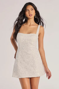Show off your beauty in the adorable Clarice formal mini dress designed with lined lace fabric and clear sequin and beaded embroidery for a soft glam look. It features a sleeveless square neckline with an underbust seam, adjustable tank straps for a customized fit, and a short A-line silhouette.