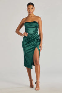 Create a flirty and fab party look in the Carlene formal mini dress designed with satin knit fabric to deliver that sleek sheen. It features a strapless straight neckline, all-over ruching to flaunt your stunning curves, a faux wrap-front design with a ruffled side sash accent, and a short bodycon silhouette.