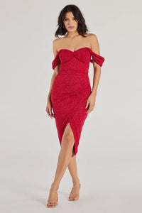 Sparkle up the party in the gorgeous Lennon formal midi dress designed with glitter knit fabric for a glam sheen that will turn heads. It features an off-the-shoulder sweetheart neckline with a ruched bust and short sleeve cuffs, a ruched faux wrap-front design creating a chic slit to showcase some leg, and a midi-length form-hugging silhouette.