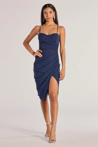 Glitz up the night in this gorgeous midi dress designed with sheer glitter mesh fabric and a knit lining for coverage. It features a sleeveless sweetheart neckline with spaghetti straps, pleated detailing at the bodice and waist, and a faux wrap-front design creating a high slit on the slim-fit silhouette.