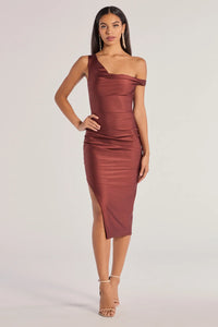Show off an iconic silhouette and flaunt your stunning curves in this midi dress designed with sleek and smooth knit fabric. It features an asymmetric off-shoulder neckline with a draped cowl design at the bust, ruched detailing, and a high-cut side slit.
