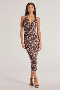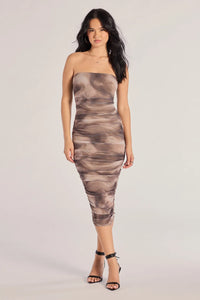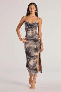 Step out and mesmerize in a midi dress that features a sleeveless square neckline, ruching throughout to enhance curves, and an abstract marble print. Complete look with strappy heels for a look that's ready for date night!