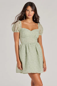 A short dress features adorable short puff sleeves, a sweetheart neckline with padded bra cups for support, a trendy tie-back design, and a flattering skater silhouette. The textured chiffon fabric has a woven and tulle lining to give the dress a flirty flounce.