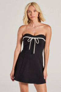 Bring an unforgettable cute vibe in this strapless ponte mini dress perfect for semi-formal events or brunch! Featuring a strapless neckline with a charming bow and contrast trim, this dress boasts an A-line silhouette and a mini-length hem for a flirty and flattering look. Complete the look with a necklace.
