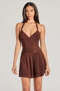 Show off your sassy style at weekend outings in this adorable halter skater dress. Made with stretchy smooth knit fabric, it features a sleeveless V-neckline, trendy tie-back halter straps leading to a partially open back, ruched seams at the waist to accentuate your curves, a short double-layered skater skirt for a flirty vibe, and a fit-and-flare silhouette. Complete the look with a charm necklace and strappy mules!