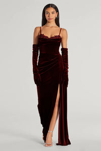 Exude gorgeous glamour and chic elegance in the Inez formal dress designed with luxe velvet fabric perfect for a black-tie affair. It features a sleeveless sweetheart neckline accented with a beaded floral applique and a cowl-draped overlay, a floor-length side sash for a dramatic touch, and a high front slit on the long slim-fit silhouette.
