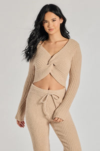 Live that cute and cozy life in this adorable crop top designed with ultra-soft ribbed chenille knit fabric. It features a V-neckline with a trendy twist-front design, long sleeves, and a fitted cropped hem. Style with the matching joggers to complete your comfy vibe!