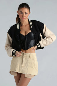All-Star Style Faux Sherpa Varisty Jacket All-Star Style Faux Sherpa Varisty JacketLayer on all-star style with this varsity jacket to showcase a preppy vibe! It features knit long sleeves with striped elasticized cuffs and woven lining, a striped elasticized collar neckline, snap-button down front closures, dual pockets with woven lining, and a striped elasticized hem. The jacket is designed with a faux sherpa lining to help keep you cozy during chilly seasons! Complete the look in trendy cargo pants and your fave sneakers for casual plans! Fit & Features - Knit long sleeves, striped elasticized cuffs, woven lining