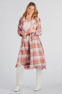 Perfect Plaid Fringe Faux Wool Trench Coat Perfect Plaid Fringe Faux Wool Trench CoatThis perfect plaid fringe faux wool trench coat will add a pretty pop of color to your winter looks! It features a lapel collared neckline, long sleeves with classic cuffed hems, a tie-front belt to cinch your waist, front pockets, a long-line hem with a trendy fringe trim, and the cutest plaid print on faux wool fabric. Layer this trench over your fave crop top and pair of denim! Fit & Features - Lapel collar