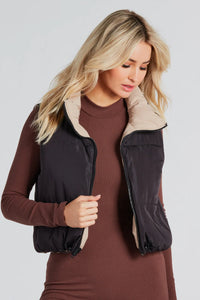 Mood Reversed Crop Puffer Vest Mood Reversed Crop Puffer VestThis puffer crop vest lets you pick your mood for the day! Layer on a comfy and cute style with this reversible vest featuring a sleeveless standing collar neckline, a front zipper closure, hidden side pockets for keeping your hands warm, and an adjustable drawcord hem. The puffer vest is crafted from an insulated woven-lined fabric that helps keep you warm and protected. Style over a basic lounge jumpsuit for grabbing coffee and errands! Fit & Features - Sleeveless standing collar neckline