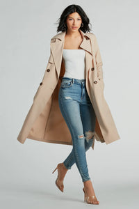 Statement Piece Tie-Waist Woven Trench Coat Statement Piece Tie-Waist Woven Trench CoatThis woven trench coat is the perfect statement piece to wear for work or casual to formal occasions! Designed with classic details, this long trench coat offers functional and chic style with double-breasted front closures and a tie-waist that cinches your waistline for a streamlined look, and convenient side pockets for keeping your hands warm. Layer over a basic midi dress, boots, and a purse for a stylish head-to-toe look! Fit & Features - Self tie-waist belt