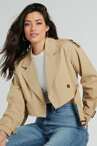 Eye For Style Twill Belted Crop Trench Coat Eye For Style Twill Belted Crop Trench CoatUnleash your inner fashionista with this woven crop trench coat - a must-have essential for the season! Featuring long sleeves with belted cuffs, shoulder tabs with button closures, and a lapel collar neckline that adds a classic utility style. The double-breasted button front closures and adjustable belted cropped hem help cinch your look together. Style with chic knee-high boots for a visit downtown! Fit & Features - Long sleeves, belted cuffs