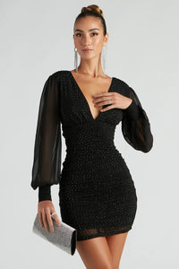 Strike a stunning pose arriving in the Alicia party dress destined to be seen on the dance floor! She features sheer long bishop sleeves, a plunge V-neckline, a sultry low-cut back, a form-hugging silhouette, and a short-length hem. The formal dress is composed of a lined mesh-knit fabric with shimmery rhinestone embellishments. Complete your dressy look with statement earrings and a clutch.