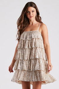 A tiered ruffle design brings voluminous fun to the Priah party dress perfect for holiday parties and celebrations! She stuns in a sleeveless, cinch elasticized square neckline, adjustable spaghetti straps for a customizable fit, and a flowy short-length hem. The formal dress is composed of a sequin-patterned fabric with a satin woven lining that glistens under the light. Style with earrings and sparkly shoes to complete the look!