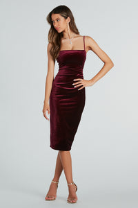 This stunning ruched velvet midi dress will bring only chic vibes to your next cocktail party. Crafted from a luxe smooth velvet fabric, this mid-length dress features a sleeveless square neckline, spaghetti straps, ruched detailing at the waist for a figure-flattering look, and a form-hugging silhouette. The velvet fabric offers a moderate stretch. Complete your dressy 'fit with strappy stilettos.