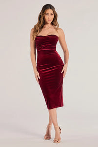 You'll be red carpet ready and radiating glamour in the Anastasia velvet formal dress and gloves set! She features a strapless sweetheart neckline with a fitted bodice, flexible boning to provide structure, pleated detailing at her slim-fit waist, a floor-length asymmetrical hem creating a dramatic thigh-high side slit, and a curve-hugging silhouette. The matching gloves feature a long-fitted design to amp up the elegance. The luxe velvet fabric offers a moderate stretch. Complete your outfit with rhinestone duster earrings and an embellished cuff.