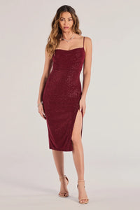 Illuminate date night in a glitter dress that features a sleeveless pleated cowl neckline, spaghetti straps, a high side slit, and a midi-length hem. Complete look with platform heels.