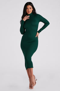 You'll adore the winter chic style of this midi sweater dress! Featuring a mock neckline, long fitted sleeves, a midi-length hem, and a form-hugging silhouette, this sweater dress is a perfect choice for casual holiday parties. The cozy brushed ribbed knit fabric offers plenty of stretch for comfortable wear. Style with ankle booties.