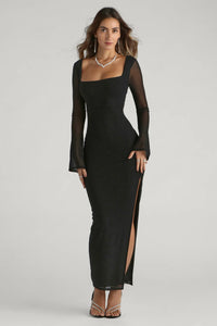 Elevate your wardrobe with this chic Becka formal long dress for fancy soirees! Crafted from sheer mesh fabric for a luxurious look, the long dress features sheer long bell sleeves, a square neckline, and a slim silhouette that hugs your curves. The high-side slit allows you to move with ease, while the stretchy knit lining ensures comfort. Take your formal style to the next level with this exquisite piece. Complete the look with a sparkly hair accessory and heels.