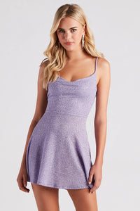 You'll be glowing in this glitter skater dress to shine at graduation parties, rehearsal dinners, and birthdays! It features a sleeveless cowl neckline, spaghetti straps, a glam rhinestone back strap with a lower cutout, and a short fit and flare silhouette. Complete the look in rhinestone platform heels for extra shimmer!