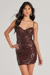 Captivate the room in the Ashley short dress showcasing a timeless sequin scroll pattern for the perfect shimmery entrance! She features a sleeveless square neckline with a lightly padded bust, adjustable spaghetti straps, a scoop-back design, and a bodycon silhouette. The formal dress is composed of a mesh fabric with a knit lining and minimal stretch. Complete your dressy look in clear strap heels for your next formal party!