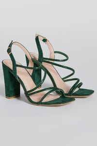 Step out onto the red carpet in these faux suede block heels exuding Hollywood glamour! They feature a square toe, a rhinestone-embellished strappy design, a block heel, and an adjustable ankle strap with buckle closure. Complete the look with extravagant earrings for a black tie affair!
