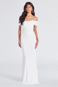 Aubriella Rhinestone And Pearl Mesh Mermaid Dress Aubriella Rhinestone And Pearl Mesh Mermaid DressSpecial Occasion Create an enchanting formal look in the Aubriella mermaid dress crafted with a lined mesh fabric embellished with mini iridescent rhinestones and faux pearls for a gorgeous shimmer. The dress features a feminine off-the-shoulder neckline with short sleeves, a wrap front and back design at the bodice, ruched side seams to accentuate your curves, and a floor-sweeping mermaid silhouette. Fit & Features - Sheer mesh fabric with knit lining, plenty of stretch