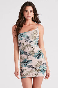This tropical mini dress will put you in vacay mode! Flaunt some skin in this sleeveless one-shoulder dress featuring a sleek bungee spaghetti strap, side ruched seams to accentuate your curves, and a bodycon fit. The dress is designed with a palm leaf print on stretchy knit-lined fabric. Complete your getaway look in platform wedges.