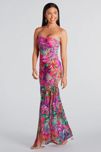 Arrive at your destination in this tropical maxi dress looking stunning and ready for fun! The maxi dress features a strapless neckline, non-slip grip lining, flexible boning, a form-hugging fit, and an effortless high front slit and ruffled flowy hem. Complete your vacation look with a handbag and sandals!
