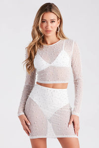 Have a glamorous night looking like a queen in this mesh crop top featuring fitted long sleeves, a crew neck, and all-over rhinestones and faux pearl embellishments. Complete the look with matching bottoms and heels.