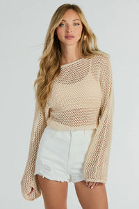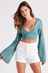 Make your mark at festivals this season in this crochet knit crop top featuring bell long sleeves, a plunge V-neck, and a sassy open back with tie closure. Style with high-rise denim shorts for a trendy look!