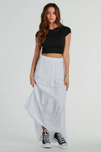 You can't go wrong while on vacay in this maxi skirt! Featuring a high-rise elasticized waistband and a flowy tiered silhouette, this skirt is designed to flatter your figure. The maxi-length hem adds a trendy touch while the soft woven fabric ensures comfort while you're relaxing under the sun or having dinner with a view! Complete the look with the matching top.
