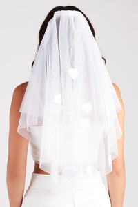 Showcase chic bridal style at your bachelorette party with this pretty tulle veil! It features a metal hair comb with a layered sheer tulle veil attached with adorable woven heart appliques. Complete your look with sparkling rhinestone jewelry and metallic silver heels!