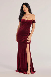 Luxe with a shimmery allure, the Alayna formal mermaid dress is designed with a glitzy glitter velvet fabric perfect for your next black-tie affair. It features an off-the-shoulder neckline with a V-cut center accent, short sleeve cuffs, ruching at the waist to accentuate your curves, and a floor-sweeping mermaid silhouette with a high-cut side slit to showcase some leg.