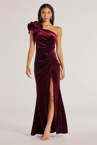 Exude bold elegance in the Freida mermaid dress designed with luxe smooth velvet fabric for your next black-tie affair. It features a one-shoulder neckline with a dramatic ruffled design, chic pleating at the bodice and waist, a faux wrap-front creating a high slit, and a floor-length mermaid silhouette to hug your curves.