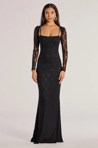 Create an elegantly chic look in the Adele mermaid dress designed with sheer lace fabric with a full-length knit lining. It features a sleeveless square neckline, adjustable spaghetti straps for a customized fit, a floor-sweeping mermaid silhouette to showcase your gorgeous curves, and a sheer lace long sleeve bolero for added coverage that can be removed.