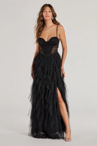 The long A-line dress features a sleeveless sweetheart neckline, adjustable spaghetti straps for a secure fit, a corset-like bodice with sheer mesh panels, and a voluminous tiered ruffled skirt accented with a high side slit. Complete formal outfit with a rhinestone clutch.